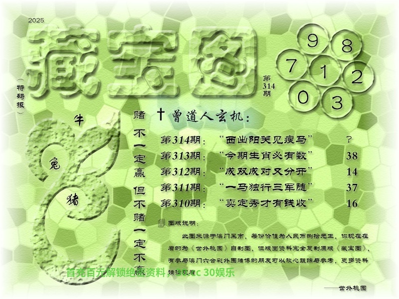 314期藏宝图曾道人玄机:西出阳关见瘦马 解:阳关,解阳肖牛虎兔羊猴鸡 解特肖:牛虎兔羊猴鸡马 |